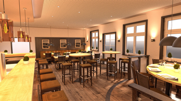 Gemütliche Atmosphäre, große Theke mit Sitzecken, Küche (noch nicht in Betrieb), Podest als kleine Bühne, großer Biergarten mit Überdachung, ...