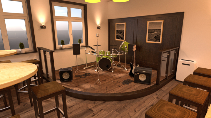 Gemütliche Atmosphäre, große Theke mit Sitzecken, Küche (noch nicht in Betrieb), Podest als kleine Bühne, großer Biergarten mit Überdachung, ...